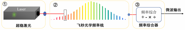 超穩光生微波源主要由超穩激光器、飛秒光學頻率梳和微波頻率綜合器這三部分組成,如圖 5所示。超穩激光器提供超級穩定的單頻激光信號,它是超穩微波的參考源,它的頻率穩定度制約著所產生的微波的頻率穩定度。飛秒光學頻率梳用來搭建一條連接超穩激光信號和超穩微波信號的橋梁,讓超穩激光直接將頻率穩定度傳承給超穩微波,得到光生微波信號。微波頻率綜合器,可以將飛秒光梳傳遞的微波信號變換至任意希望的頻率值上。