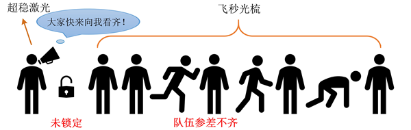 如果把超穩光生微波源比作排隊走的隊列,那么超穩激光就像隊列里面的帶隊人,隊伍的步伐大小、整齊度、每位隊員的相對位置都由這個領隊決定。飛秒光梳就像隊列里面的隊員,在沒有和超穩激光建立聯系之前,光梳是自由運轉的,就如圖 6中所示的一樣混亂。而當通過一系列復雜的操作和領隊建立聯系后,就能使得每位隊員的步伐大小、步速、以及和其他隊員的相對位置都和領隊高度同步,如同圖 7所示,這樣就產生的超穩光生微波信號。