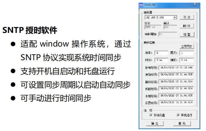 -技術指標- 網(wǎng)絡和服務 ●NTP v1/2/3/4(單播/多播/廣播/Autokey),SNTP; ●Telnet,SSH,F(xiàn)TP; ●SNMP v1/2/2c/3,MIB II (RFC1213); ●IPv4、IPv6、IPv4/IPv6 Hybrid。 服務性能 ●衛(wèi)星參考下同步精度 :<100ns; ●用戶容量 :>5,000,000; ●NTP請求量 :≧139000次/秒; ●可通過軟件配置支持IEEE1588v2(PTP)協(xié)議。