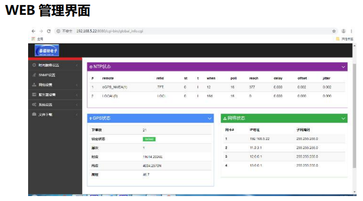 ●方便快捷、開箱即用,用于對設備進行全局監(jiān)控; ●含設備運行狀態(tài):NTP狀態(tài)、北斗/GPS狀態(tài)、網(wǎng)絡狀態(tài)等; ●可進行SNMP設置(Trap地址等)、網(wǎng)絡設置、NTP設置; ●可開關服務器當前運行的服務; ●可下載相關配置文件和MIB描述文件。